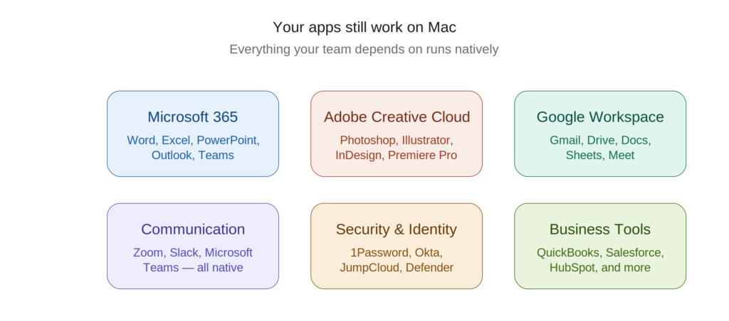 Zoom, Slack, 1Password, QuickBooks — all native Mac apps, all fully supported.