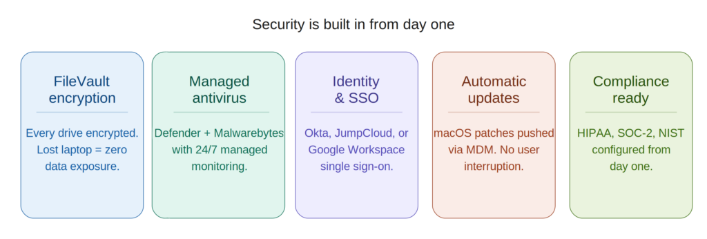 Compliance ready — Need HIPAA, SOC-2, or NIST? We configure your Mac environment to meet those standards from day one.